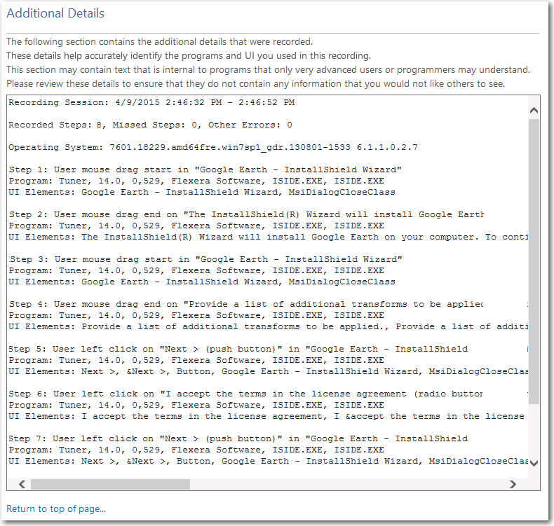 You can use the Microsoft Steps Recorder documentation tool with Tuner to automatically record the step-by-step actions that occur during response transform creation. This information, which is saved in a web archive (.mht) file, includes a text description of where you clicked on each screen, along with a screen capture for each click.