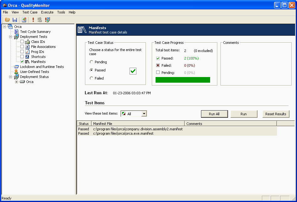 When testing is finished, results are recorded in the Test Case Progress area. Also, the Status of each test item (Passed, Failed, or Pending) is listed next to the Manifest File name.