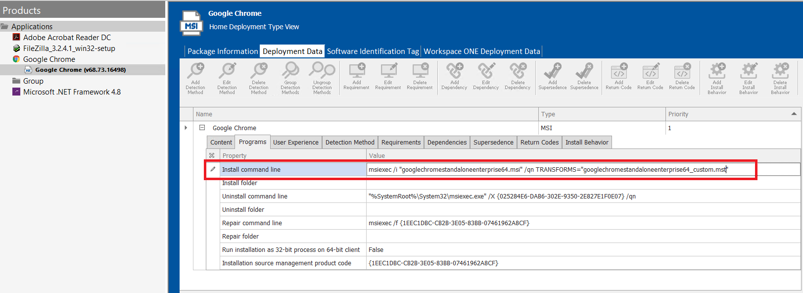 • The visual indicator represented by the pencil icon signifies that the install command line is being retained from the older version application in the catalog for the same newer version application.