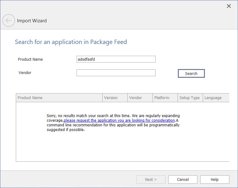 • If you search for a package that is not available in the package feed, you will see a hyperlink message. Clicking the hyperlink will open the New Package Request Wizard, where you can submit a package request.