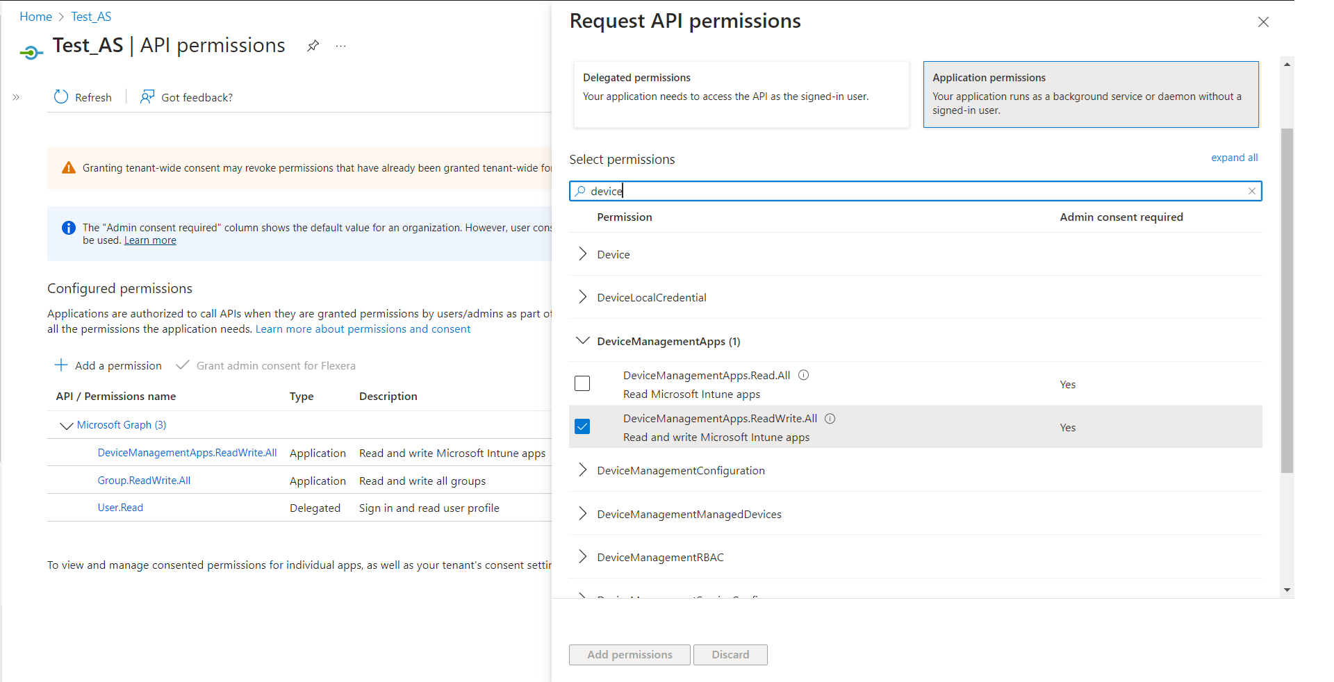 - Under DeviceManagementApps select DeviceManagementApps.ReadWrite.All and click Add permissions.