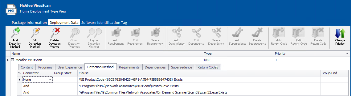 The Detection Method subtab of the Deployment Data tab of the Home Deployment Type View lists methods to detect whether this package is already installed on the target system.