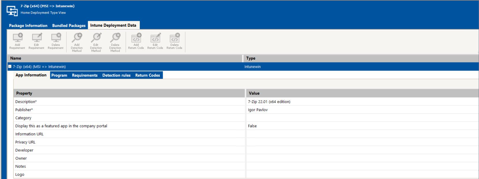 AdminStudio supports publishing of MSI, MSIX and Intunewin package types to Microsoft Intune. The Intune Deployment Data tab appears only for the supported package types. The Intune Deployment Data Tab displays various deployment related properties organized in subtabs for easy navigation. You can view and edit properties values either inline or by using the easy-to-using wizards in Detection rules, Requirements and Return code subtabs.